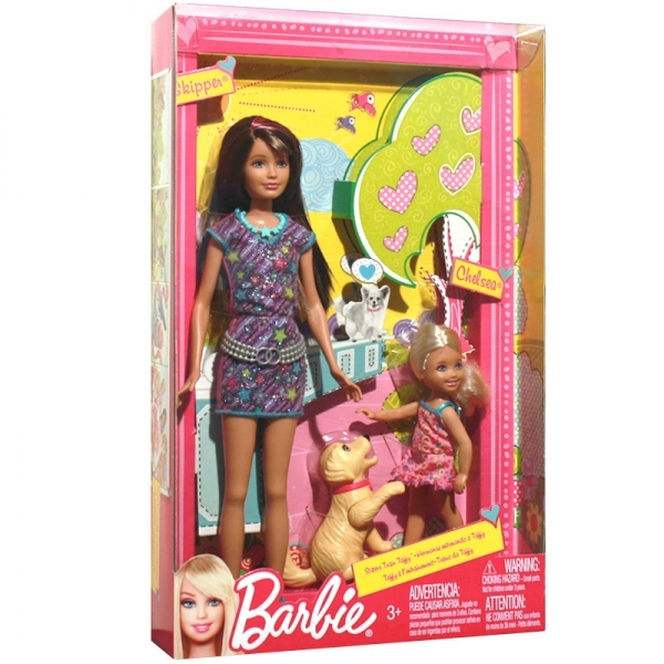 Barbie Dupla de Irmãs Skipper e Chelsea: nesta versão a diversão é dobrada. Em um dia de diversão em família a Skipper ensina a sua irmã Chelsea a treinar o seu lindo cachorrinho. O kit vem com acessórios que aumentam ainda mais a realidade à brincadeira. As meninas viverão grandes aventuras na companhia dessas duas irmãs.
